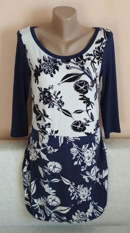 Девочки, платье бесподобное: оочень нежного принта в цветы, прямыми рукавчиками 3\4, по бокам маленькими заокруглёнными вырезами, комбинированного склада: верх белого цвета в чёрные цветы обрамлены синим цветом, а низ - синего цвета в белые цветы обрамлены чёрным цветом, смотрится потрясающе красиво и оочень женственно ложится по фигурке благодаря ткани. Размер указан 8\36, НО, большемерит, наш 44-46 и даже не большой 48, замеры: длина от плеча 80 см, вырезы 8 см, плечи 38 см, ПОГ 44 см ( + есть вытачки и тянется до 55 см ), ПОТ ( отрезная линия талии ) 42 см, тянется до 50 см, ПОБ 48 см + тянется, рукавчик сверху 45 см, снизу 32 см. Ткань, состав: 97% вискоза, 3% эластан, нежнейшая и оочень приятная к телу, отлично тянется! Бренд - George, made in Turkey. Спрашивайте, пожалуйста, оочень красивое, нежное, женственное;-)... Отправка или УП или НП, оплата за доставку при получении;-)...