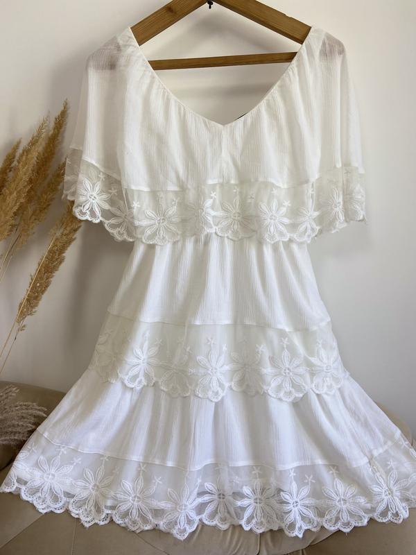 Біле мереживне плаття з воланом . Довжина до коліна. Плаття ніжного білого кольору. Збоку замок, на підкладці, не світиться. Ідеальний стан. Ця проста вишукана річ прикрасить Вас по дорозі на пляж або під час відпочинку. Приємне доповнення до Вашого літнього гардеробу. Розмір S