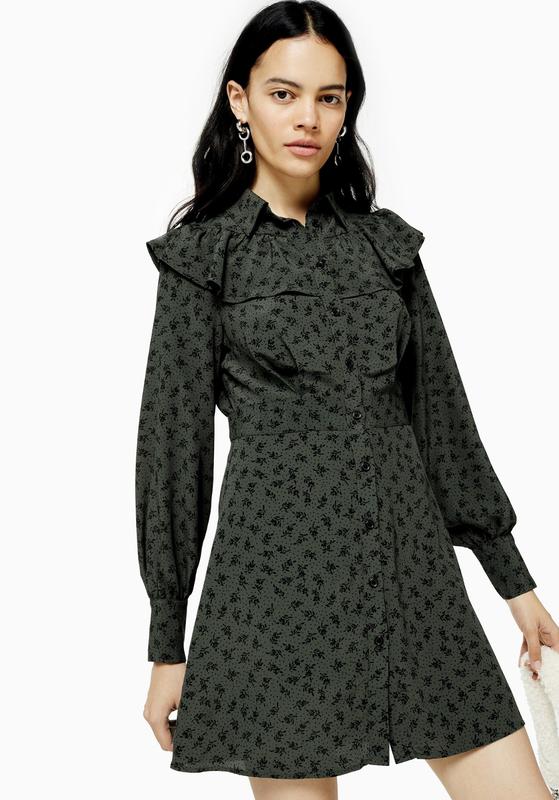 Новое красивое платье с воланом в цветочный принт. Стильно смотрится как с грубыми ботинками, так и обувью на каблуке. Застежка по переду на пуговицы, рукав свободного кроя. Длина 82 см. Бренд Topshop. По всем вопросам обращайтесь)
