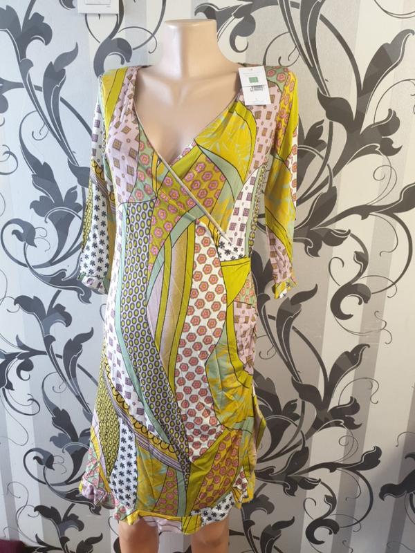 Сукня верх на запах, приємне до тіла, розмір вказаний L, але воно маломирить S, віскоза 95 %. Виробник Італії.