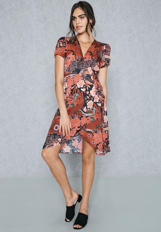 Восточные принты повсюду. Шикарное платье Размер указан L Ткань из полиэстера с атласной отделкой V-образный вырез и короткие рукава с буфами Передняя часть с имитацией запаха и поясом на завязках. Боковая потайная планка на молнии. Асимметричный фасон с высоким и низким подолом.