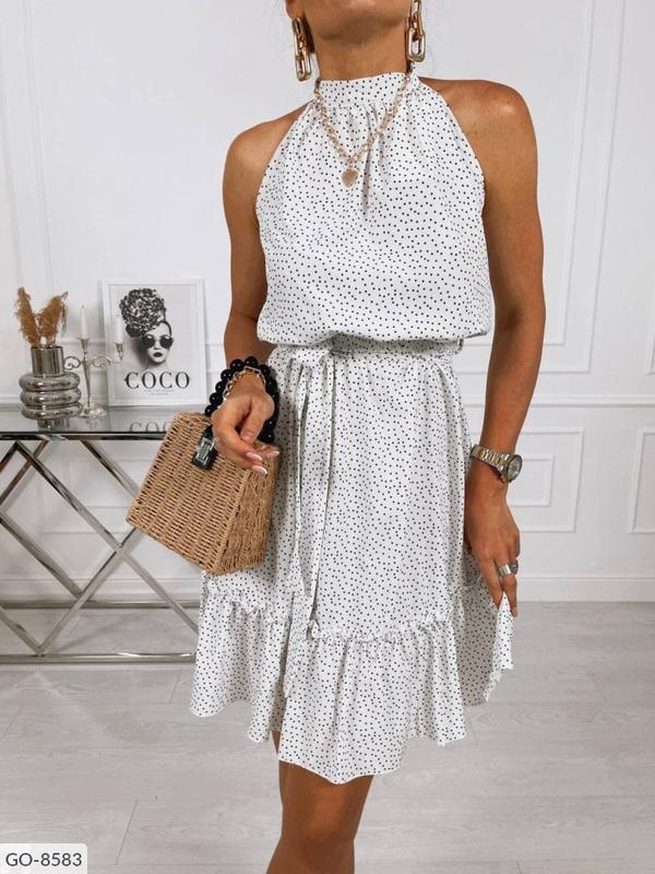 Сарафан GO-8583 Размеры: S, M, L, XL Ткань: супер-софт Цвет: белый+горох Описание : свободное легкое платье сшитое из тонкого софта в трендовый горошек. Изделие приталено благодаря поясу и расклешено к низу - оснащено воланом. Платье миди длины без рукавов с американской проймой.