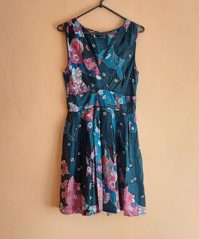 100% шовк, Підкладка-70% шовк, 30% бавовна Розмір UK 12 Виміри в спокійному стані Довжина 92 см, Напівобхват грудей 42 см, Напівобхват талії 37 см Напівобхват по низу 95 см Плечі 38 см *124*