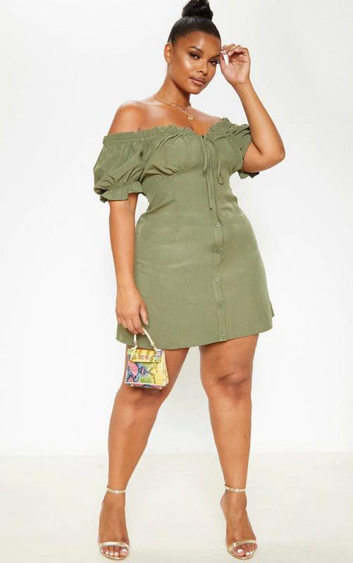 плаття прямого крою з пишними рукавами та гудзиками спереду бренду PrettyLitlle Thing кольору хакі Розмiр ик 18 Параметри Груди ПО 55 см Талія ПО 50 см Бедра ПО 65 см Тканина: 95% поліестер 5% еластан