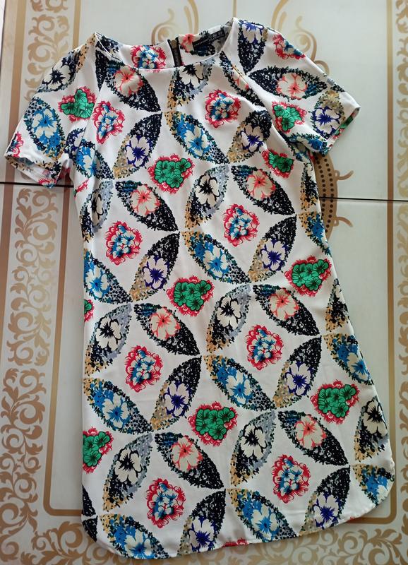 Стильна , фірмова сукня у цікавий принт , плечі вільно , ПІГ 44 , ПІТ 42 , ПІБ 46 , довжина виробу 86 . Тканина не просвічує .