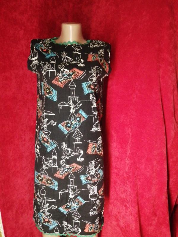 Офигенное платье, с интересным принтом. Почти новое, одевалось может раза 4. Замеры : длина изделия по спинке 98 см, плечи 39 см, полуобхват груди 46 см, полуобхват бёдер 45.5 см, низ платья 45 см.