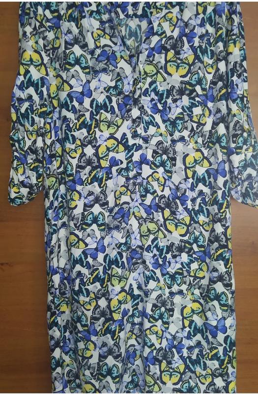 Легке плаття-сорочка в метелика,з віскози,рукав 3/4 Заміри: Довжина від плеча спереду-85см Довжина ззаду-94см ПОГ-51см ПОБІДИ-53см Рукав-46см Плечі 38см Є петельки для пояса,з боків невеликі разрезики Розмір вказаний 10
