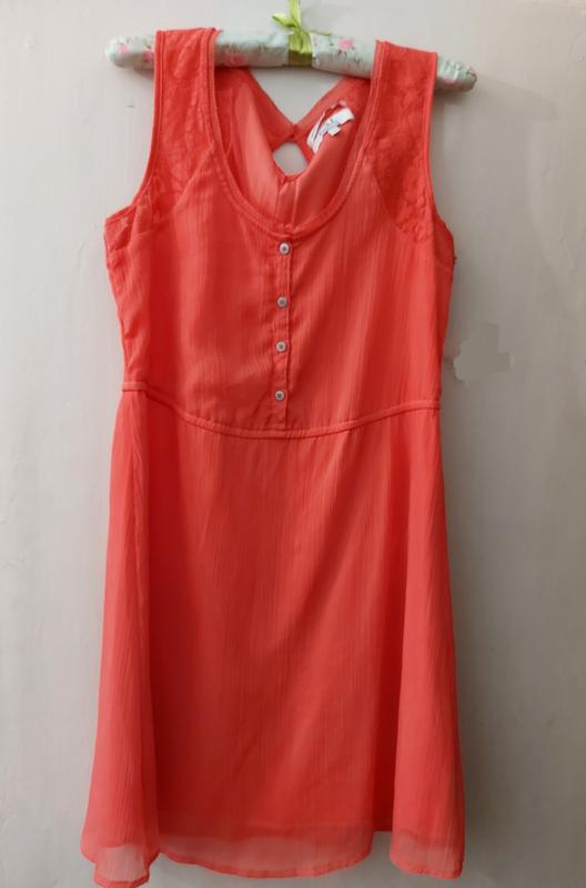 Очень красивое шифоновое платье, лёгкое, нежное и яркое. Талия на резинке. Полностью на подкладе. Украшен красивыми пуговичками (рабочие). Цвет более нежный, не такой яркий как на фото. Качественный пошив, нитки не торчат. Состояние идеальное. Размер М.