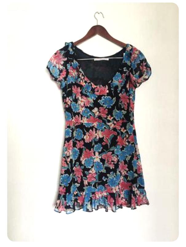 Легке повітряне платтячко в квітковий принт на підкладці, на блискавці збоку, з воланами по грудях і низу, заміри: пог 43, піт 38, побіди 51, плечі 36, довжина 82 Стан ідеальний!