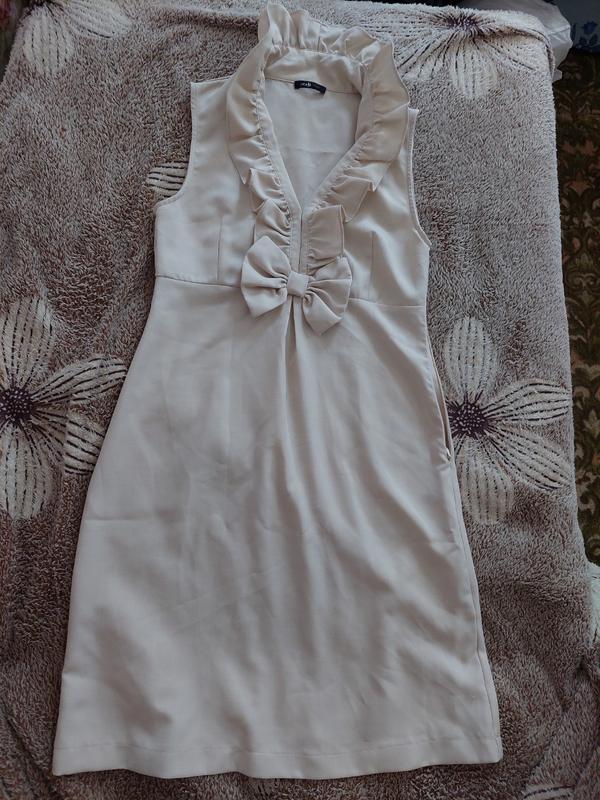 плаття з бантом, збоку застібається на блискавці. дуже гарно сидить на фігурі. колір ніжно тілесний або навіть капучіно дов-88см. пояс-36см, п.г-41см