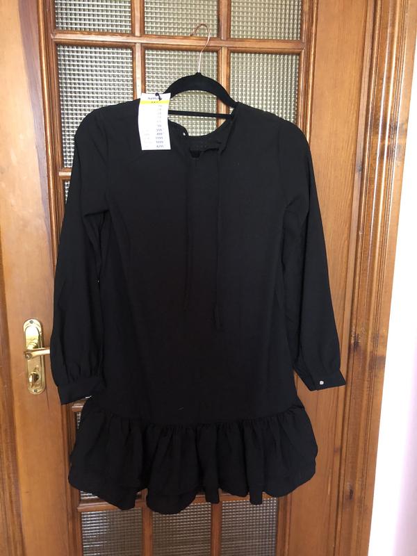 Нове чорне плаття . Продаю бо не підійшов розмір.Розмір XXS але підійде на S. Довжина плаття 80 см, плаття прямого силуету тому об'єм талії 88 см. Довжина рукава 56 см. Манжет призібраний на гудзику. По низу подвійна рюша. Шийка на зав'язочках.