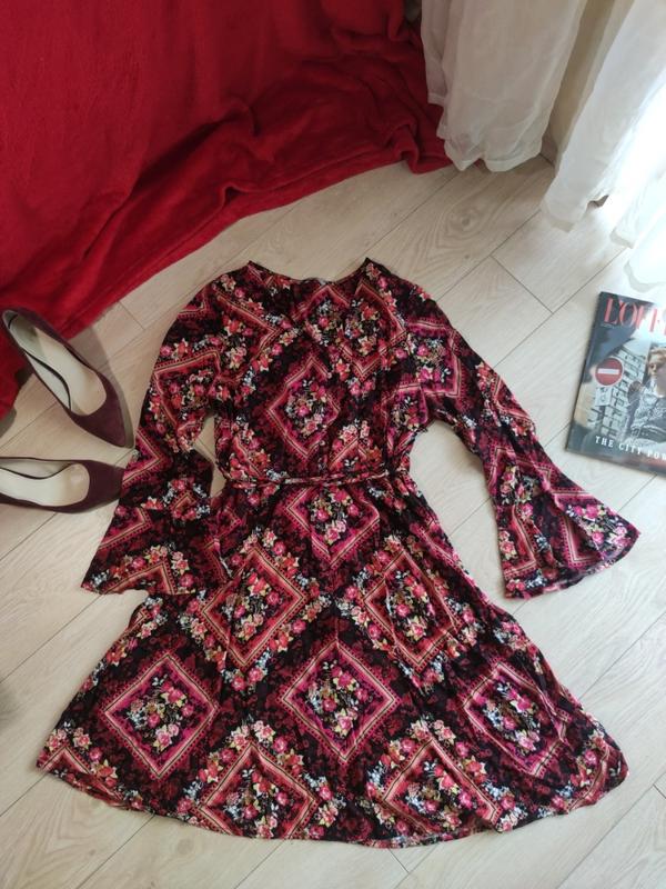 Сукня з оригінальним принтом. Спереду гудзики обтягнуті тканиною, збоку прихований замочок, є тоненький поясок, на рукавах рюша. НОП 39 НОГ 56 НОТ 52 НОБ 80 довжина 96 довжина рукава 60Ьканрнатне вказана, схоже на натуральну