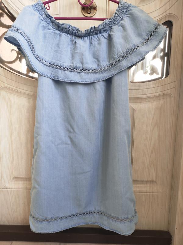 плаття джинсове з відкритими плечима, А силуету, вільне, легке, з рюшею навколо плечей, яка на резинці. колір ніжно блакитний. є кишені по боках. розмір 6-8.