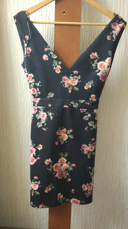 Очень красивое платье в цветочный принт, с открытой спиной и декольте. Размер S, но пойдет на М .
