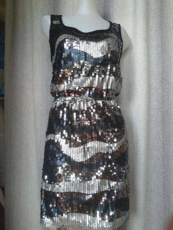 Женское летнее вечернее вискозное блестящее платье с пайетками, сарафан, новогоднее, вечернее, нарядное для корпоратива состав : спинка 100% вискоза -легкий тонкий летний футболочный трикотаж, насыщенного черного цвета. Спереди сетка по всей длине украшено пайетками. Изнутри есть тонкая подкладка из полиэстера. размер S, но ориентируемся по замерах, замеры: Плечи - 33 см, ПО груди -40-45 см, ПО талии - 32-42 см, резинка ПО бедра 44-50 см (на 20 см ниже талии), ПО низа 47-55 см Длина 85 см, Несмотря на то, что украшено пайетками - очень и очень легкое. классно смотрится.