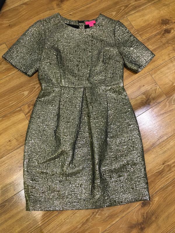 Красиве плаття, гарно корегує фігуру) дуже гарна тканина із золотою ниткою , стан ідеальний, немає жодної затяжки . Додаткові фото та заміри кину. Куплене в Америці .