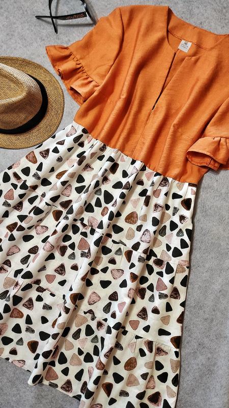 Оригинальное, комбинированное платье, свободного кроя в стиле бохо. Ткань лифа - лен бохо. Ткань низа - лен. Рукав короткий с оборкой.
