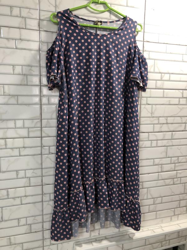 Плаття в горошок Розмір 54 наш Склад тканини не вказано ,не тянеться Довжина 95/104 Пог 61- є виточки Поб вільно до 73