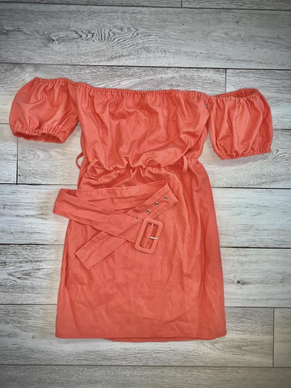 Очень крутое соблазнительное оранжевое платье с красивыми объемными перчатками, поясочком и открытыми плечиками