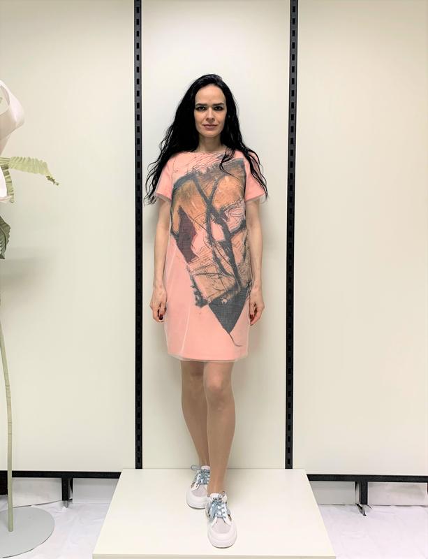 Літня яскрава сукня з дизайнерським принтом з з-д ефектом на тонкій сітці верхнього шару. Футболка прямого силуету з тканини з високим вмістом льону створено для комфорту в поєднанні з виразністю в літні будні. Нетривіальний малюнок притягує увагу, додає свіжості образу.