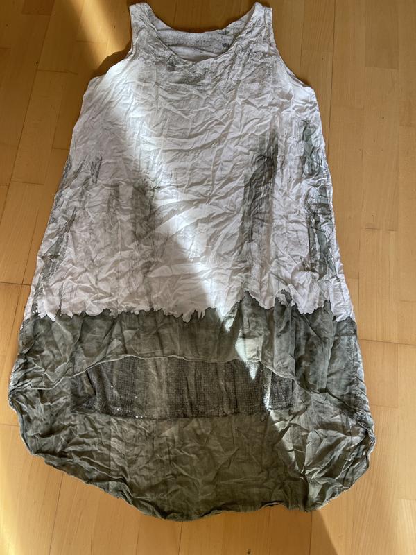 Платье, Италия. На подкладке. Вискоза 100 % верх, вискоза подкладка. Подкладка по структуре ткани трикотаж, легко тянется. Размер не укавзан. ПОГ 50 см, ПОБ 61 см, длина впереди 88 см, сзади 102 см. Небольшие катышки на подкладке.