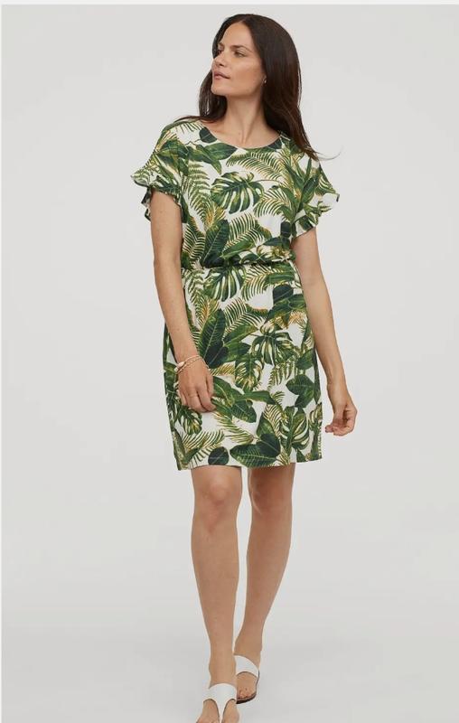 Повітропроникна сукня з льону та віскози. Принт неперевершений - тропічне листя пальм. В стані нового розмір XL заміри: напівобхват талії (см) - 46, тягнеться до 60 напівобхват бедер (см) - 58-72 (має бути вільно) довжина (см) - 98 льон - 55%, віскоза - 45%