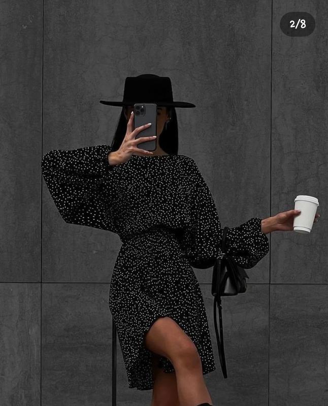 Плаття в горошок, чорного кольору, дуже жіночне та комфортне. Тканина королівський софт. Розмір М-Л (44-46) Довжина 90 см Талія на резинці, доже добре тягнеться. Ог до 105 см От 70 ( в не розтягнутому стані) Об до 105 см