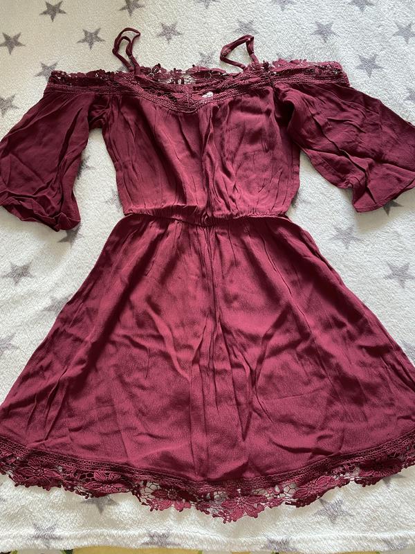 Ошатна сукня з мереживом , колір марсала. Стан ідеальний. Розмір 32. Заміри: ОГ 40см, ВІД 26-30см (гумка), довжина 78-85 (шлейки що регулюються), довжина від талії 40см.