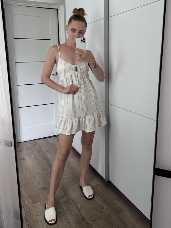 Коротка літня сукня від Stradivarius З цікавим кроєм на грудях та з воланом по низу Склад повністю натуральний: віскоза, котон та льон Стан чудовий 👌 Розмір вказано М Мій зріст 165