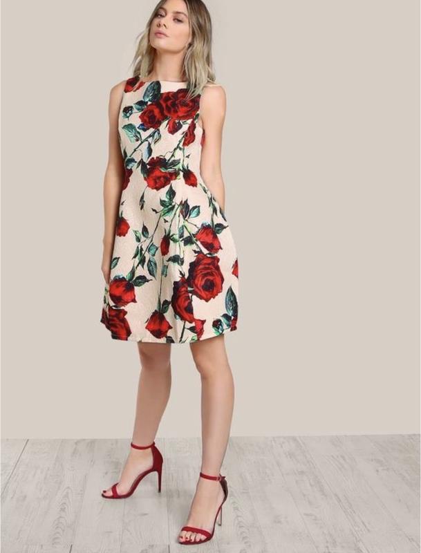 Платье в стиле Dolce&Gabbana. Жаккардовая плотная ткань держит форму. Нюдово бежевое, яркие красно зелёные розы. Юбка колокол. Эффектное, по бокам вставлены косточки жесткости, как в корсетах, очень стройнит Размер указан uk14/eur 42 Длина 94, пог 47-48, пот 42, поб 71 Есть нюанс на замке, последнее фото, легко заменить на новую собачку или оставить так. На функционал замка не влияет.