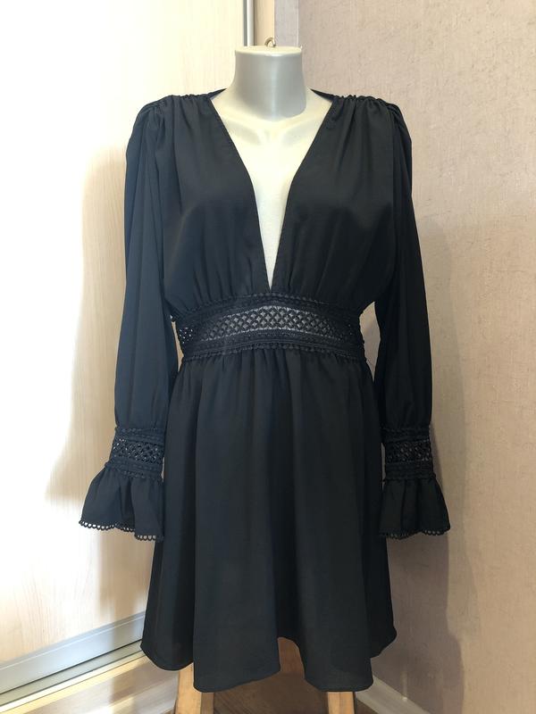 Нежное платье с V-образным вырезом и с кружевом по талии и рукавам.Сбоку потайной замок.