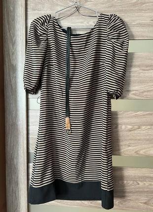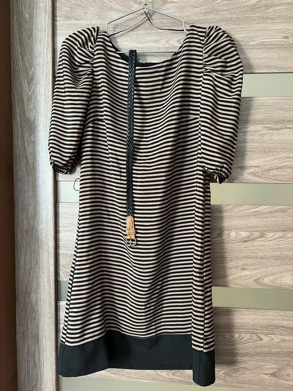 Супер класне плаття на літо, з легкої тканини, в дрібну чорно-бежеву смужку, з актуальними рукавами-ліхтариками. Трендовий відтінок. До плаття додається ремінь чорний, плетений з дрібних смужок, новий, йшов у комлекті Довжина виробу ~85-90см. Розмір С