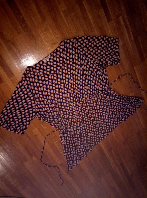 Дуууууууже величезна!!!!! 58розміру (!) Паперових бірок немає! (( Легенька, тонка, з пояском-затяжкою, з двома боковими кишенями, рукав 3/4. Довжина 85см, плечі 47см, рукав 37см, півобхват біцепса 25, пройма рукава 33, ПОГ-ПОТ-ПОБ 76см-74-88см.