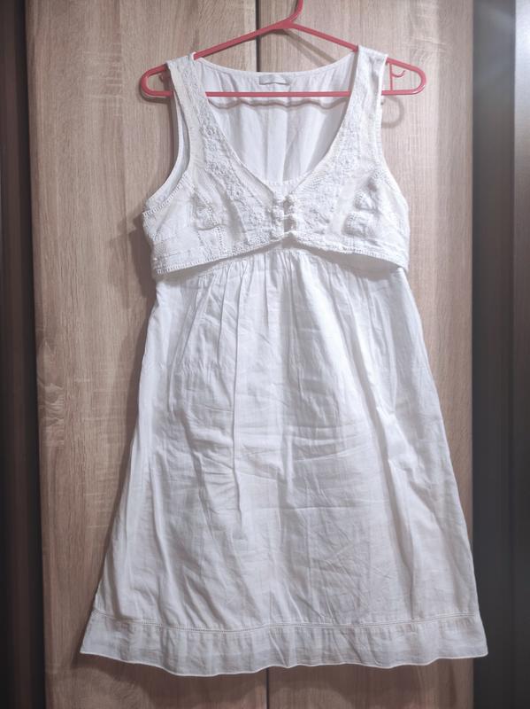заміри довжина від плеча 87 до низу,довжина від грудей до низу 56,ширина в грудях 40, під грудьми 39 внизу 60,тканина натуральна,не розтігується,вшитий підюпник,не просвічується,збоку є замочок.Бірка з розміром відсутня.