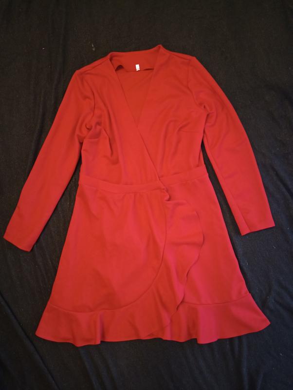 Сукня червоного кольору з запахом на зав'язках. Стан задовільний, одягала декілька разів. Колір насичено червоний, тканина розтягується.