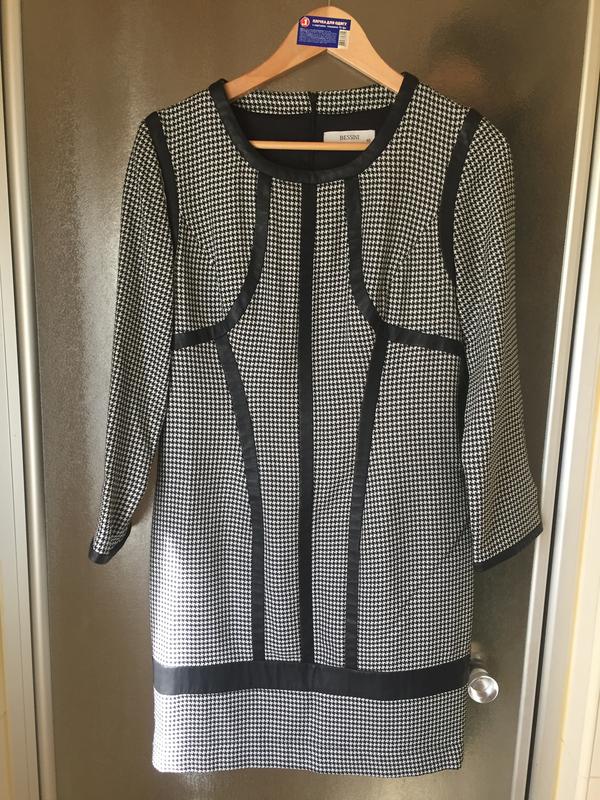 Плаття-міні,оздоблене прошитими стрічками зі штучної шкіри,вигідно підкреслює фігуру,сидить по ній,приталене,ззаду прихована змійка,хороша якість тканини,підкладки та оздоблення.