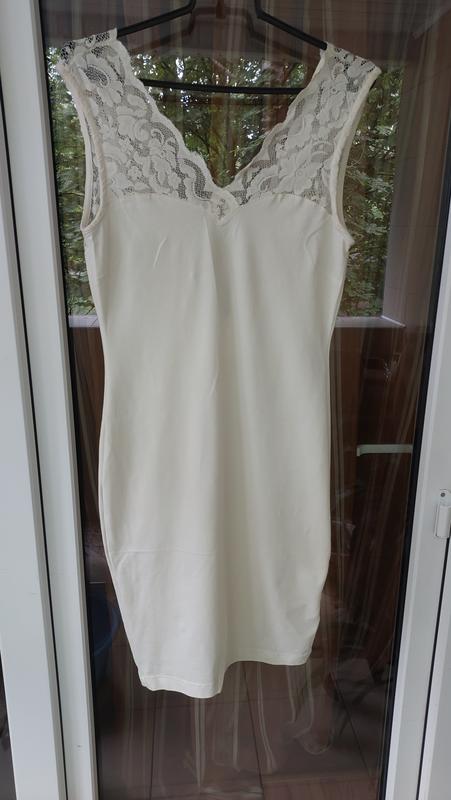 Плаття майка, завдяки ніжній гіпюровій вставці має делікатний вишуканий вигляд. Колір бежево кремовий. Додаткові фото і заміри на вимогу.