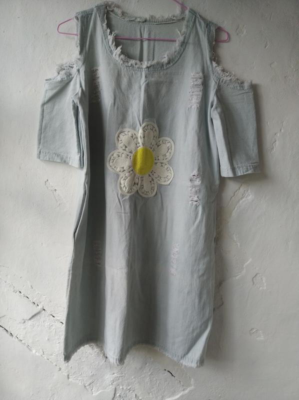 Джинсовое платье светло голубого цвета, размер S,M. Рукава чуть чуть не достают до локтя и есть специальный вырез , чтоб были видны плечики. По бокам есть два карманчика, по центру платья красивая кружевная нашивка в виде ромашки. Длина до колен.