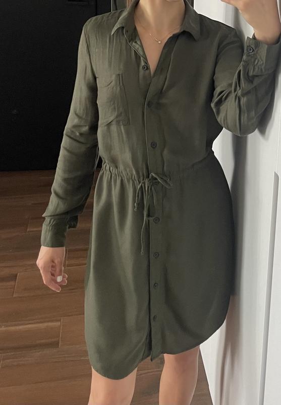 Сукня-сорочка з м'якої тканини. Застібка на ґудзики спереду, а також нагрудний кишеню. Сукня відрізна по куліску на талії. Довгі рукави з вузькими манжетами на гудзику і округлений нижній край. Без підкладки. Розмір З/36