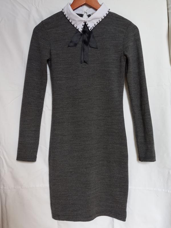 Плаття сірого кольору, по фігурі. Чорний бантик знімається. Розмір S Довжина рукава - 58 см ПОТ - 33 см ПОБ - 40 см Довжина плаття - 90 см