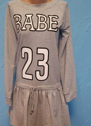 Сукня двухнитка, з довгим рукавом, сірого кольору. Має незвичайни крій, низ у вигляді спіднички. Довжина по спинці - 94 см. Розмір М-L.