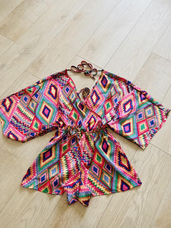 Шикарний Ромпер в яскравий принт. Спереду застібається на кнопку. Спинка відкрита. Сідати дуже красиво. Матеріал легкий і дуже приємний до тіла. Розмір S, підійде і на XS