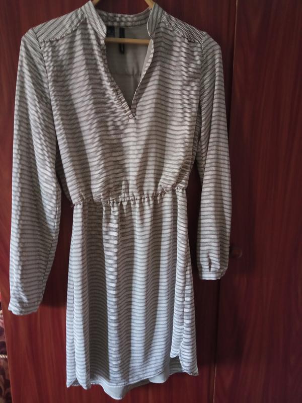 Легке, легку сукню, виробник Індонезія. Розмір XS, USA-2. На наш 44,46. Спинка трохи видовжена, довжина 94см. Напівобхват під пахвами 46см . Без пояса, на гумці, на підкладці. Манжети на гудзиках. Принт біло-коричневий.