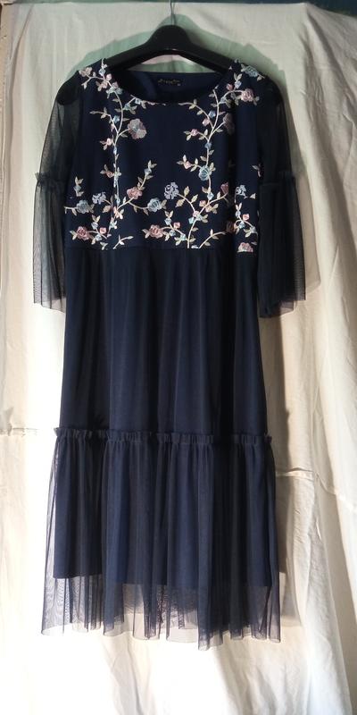 Легка сукня з квітковою вишивкою на грудях та спині. Фатинові рукава(3/4) та спідниця. Присутня підкладка. Замочок збоку. Стан новий, вдягалася один раз на випускний. 🌌 Параметри: • Груди - 40см, рукав - 3/4 • Талія - 40см • Довжина - 95см, підкладка- 48