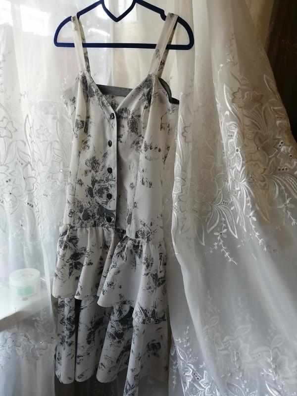 Продам сарафан, платье молочно белого цвета с чёрным принтом, узором. Ткань натуральный лен, ПОГ-40 см, талия-78 см, ПОБ - 47 см, длина от плечей-104 см, от верха до низа без бретелек 86 см. Два нижних волана, стройнит