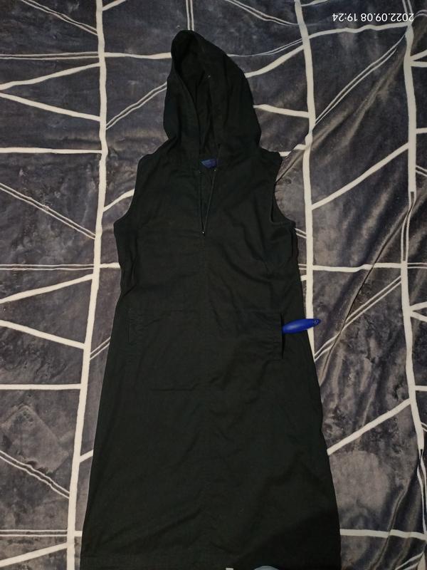 Сарафан з капюшоном чорного кольору розмір 14. Спереду є кармани типу кенгуру, виріз на замочку .З зворотнього боку є розріз.