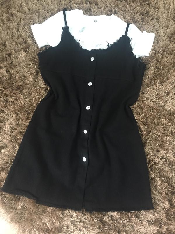 Сарафан двійка чорний можна одягати під сорочку, водолазку, тканину як під джинс, сарафан йде прямим пошиттям, футболка вкорочена, підійде на розмір 42-44, заміряю -250 грн Пересилаю за рахунок покупця 100% оплата на картку Приватбанку Повернення не передбачено