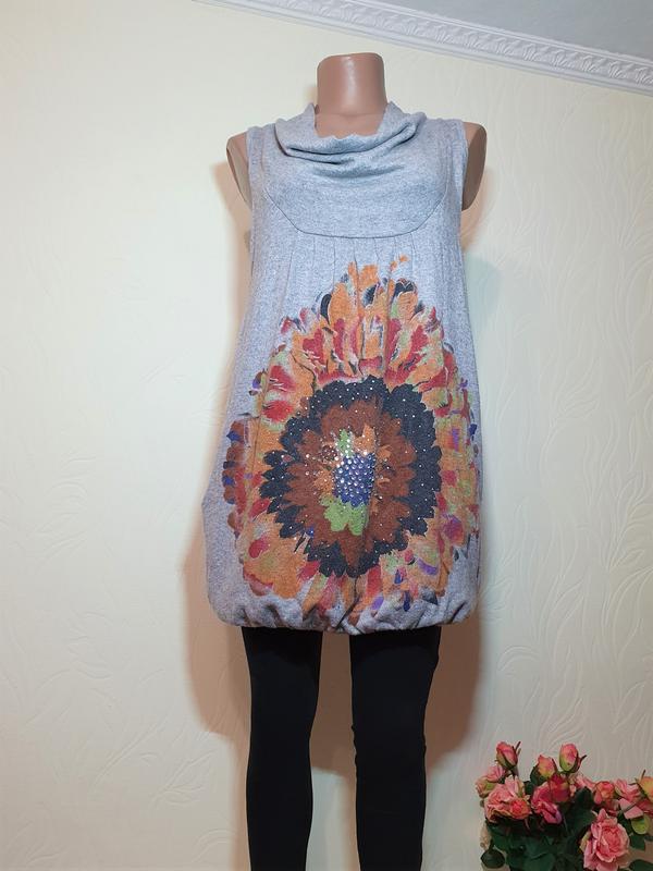 Интересное платье-баллон, покрой свободный, носить на гольфик, лонгслив Тепленькое, бирки с составом нет, на вид как шерсть с вискозой. Есть карманы по бокам внутренние. Состояние хорошее, но отсутствуют некоторые стразики на рисунке-цветке. ПОГ - 48 + ПОТ - 54 + Низ - 39 + Длина - 74 см.