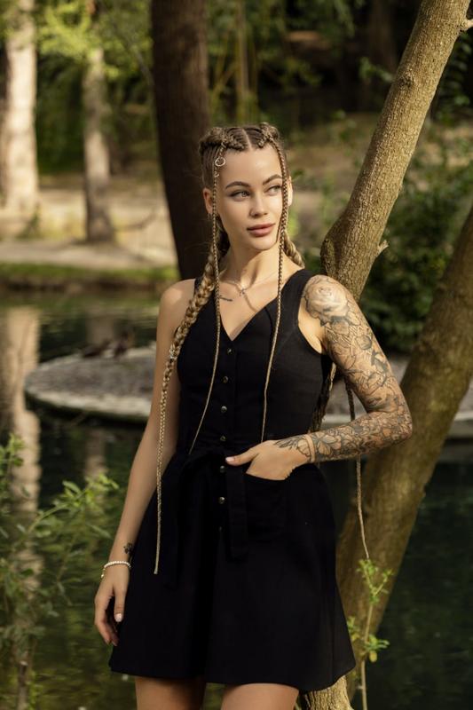 - материал: лен; - состав ткани: лен 80% + вискоза 20%; - сарафан застегивается на кнопки, которые доходят до середины юбки; - спереди V-образный вырез; - два накладных кармана спереди; - В талии есть шлевки для пояса. Декоративный пояс в комплекте, в цвет сарафана. Юбка имеет свободный крой. 📌Черный: #1629306065