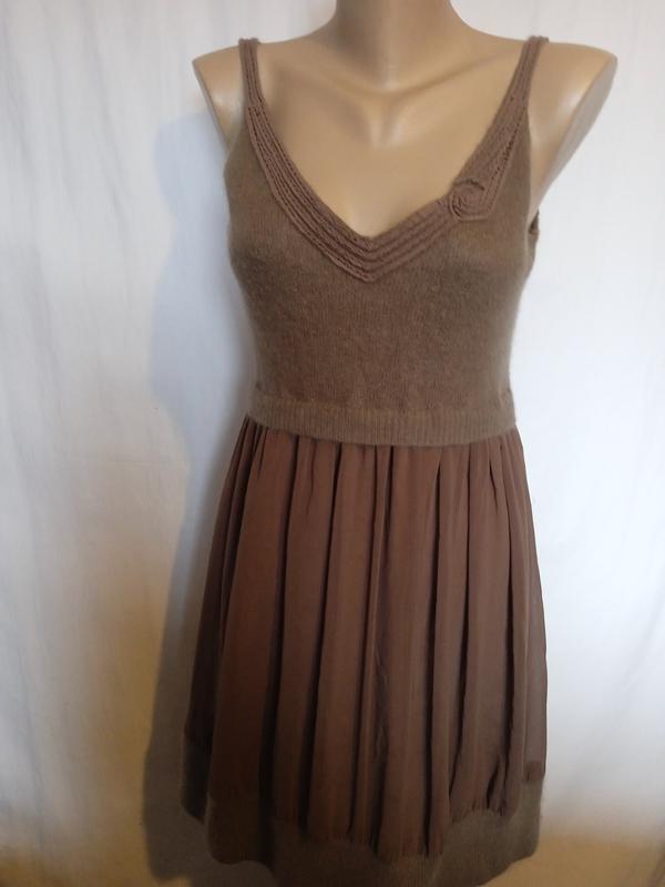 сарафан очень красивый,оригинальный,цвет бежевый,сочетание ангоры(верхня часть и полоска на юбке внизу) тонкой нежной ткани шифон (нижняя часть, юбка)на шелковой подкладке,имитация маечки с юбкой, длина сарафана84,пог44-46